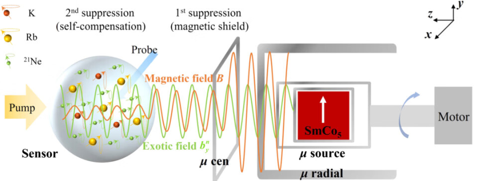 在实验中,研究员将 SmCo₅ 永磁体结合软磁外壳加工成微型自旋源,并由电机驱动旋转,从而产生类似经典电磁场的信号。如果轴子介导的“第五力”存在,这个旋转的自旋源同时会像天线一样发射出由第五力产生的奇异电磁场信号。而在另一端,一只精密的原子传感器“耳朵”被竖起检测电磁场信号。研究团队使用的是 K-Rb-21Ne 共磁力仪,其可以感受到奇异电磁场效应,进而产生可被观测到的自旋方向改变。