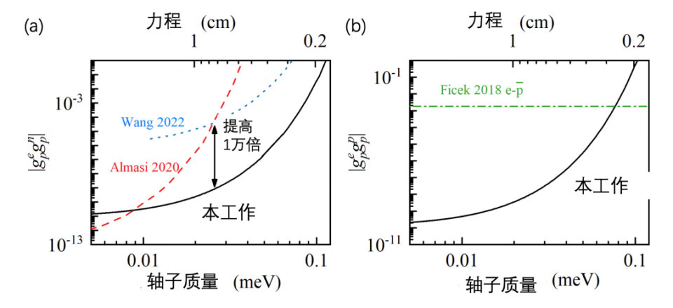 最终实验没有观测到预期的第五力信号,但在 0.01meV–0.1meV 的轴子质量区间内,对电子自旋-中子自旋及电子自旋-质子自旋耦合常数给出了迄今最严格的实验限制。在轴子质量约 0.02meV 处,较此前结果提升了超过 1 万倍。