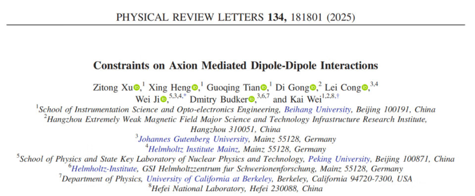 1.Xu., Z. et al. Constraints on Axion Mediated Dipole-Dipole Interactions. Phys. Rev. Lett. 134, 181801, 2025. https://doi.org/10.1103/PhysRevLett.134.181801