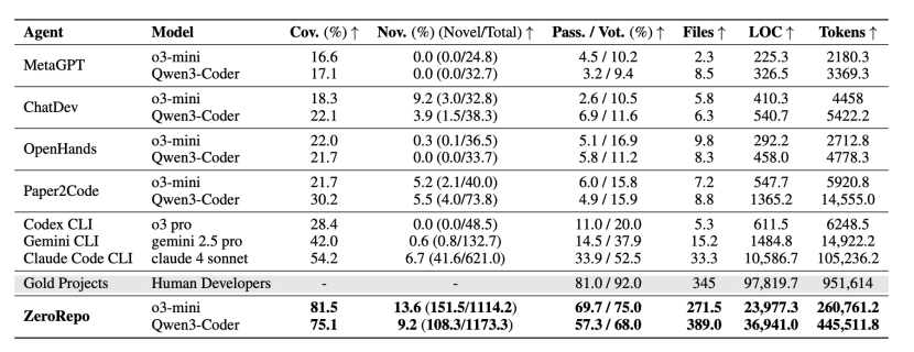 功能覆盖与规模:覆盖率达81.5%,比最强基线Claude Code高27.3个点;还能生成超100个新功能(创新率11–13%),远超其他方法。生成仓库平均36K行代码、445K tokens,是Claude Code的3.9倍、其他方法的64倍,复杂度接近人工项目。
