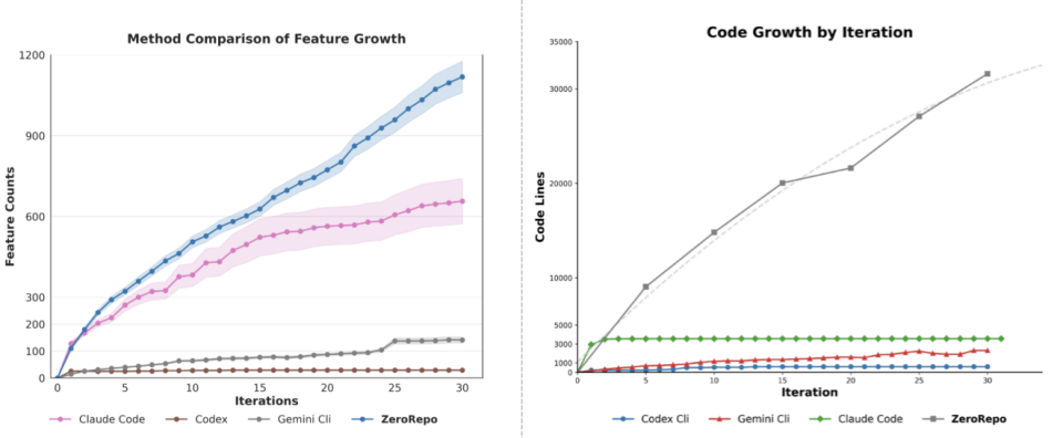 ZeroRepo随规划迭代次数增长功能数量(左图)和代码数量增长情况