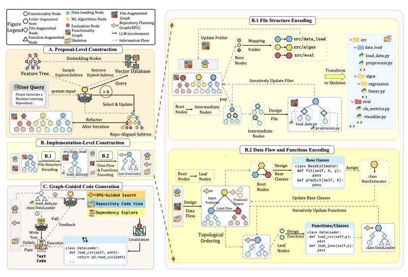 ZeroRepo流程概览:(A)提案级构建:将用户需求转化为功能图谱;(B)实现级构建:进一步细化为文件结构和数据流,形成Repository Planning Graph (RPG);(C)图驱动生成:沿拓扑顺序遍历RPG,逐步生成完整仓库。