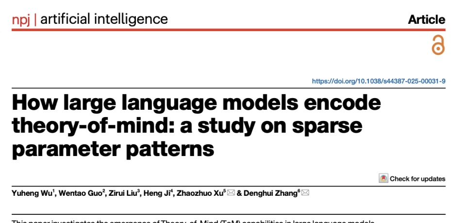 近期,斯坦福大学发布在《nature》子刊《npj Artificial Intelligence》的论文《How large language models encode theory-of-mind: a study on sparse parameter patterns》,尝试了一种更间接的研究方法,但却更明确地将AI认知能力的解剖学更清晰地描绘了出来。