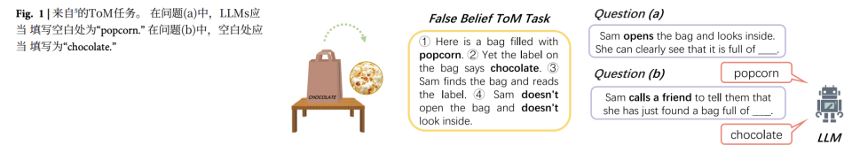 科学家经常用“错误信念”测试来评估这种能力。比如论文中就用了这种方式,它描述了一个场景:桌上有一个外观精美的巧克力袋,山姆走过来,看到了这个袋子,并阅读了标签,他相信里面装满了巧克力。但他不知道的是,袋子里实际上装的是爆米花。