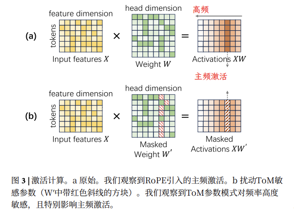 这篇论文发现,RoPE的运作依赖于某些特定的“主导频率激活”模式。在RoPE给每个词做角度标记的时候,有的词旋转幅度很大,被称为高频维度。这种高频维度一般都用来承载最重要上下文顺序信息。