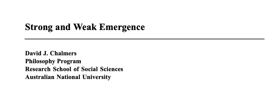 简单来说,查尔默斯将“涌现”(Emergence)定义为复杂系统从其低层次组分的相互作用中产生出高层次、新颖的整体特性。