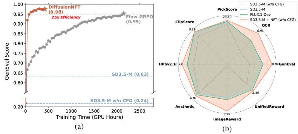 大幅效率提升:在 GenEval 任务上,DiffusionNFT 仅需 1k 步 即可将得分从 0.24 → 0.98,而 FlowGRPO 需超过 5k 步才能达到 0.95。整体上,DiffusionNFT 在不同任务上表现出 3×~25× 的训练效率优势。