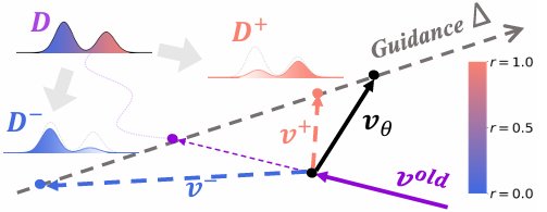 强化指导 (Reinforcement Guidance):在数学上,DiffusionNFT 将优化目标刻画为对旧策略分布的偏移量 ∆,这一过程与 CFG 类似,但不依赖双模型结构,而是内生于训练目标中。