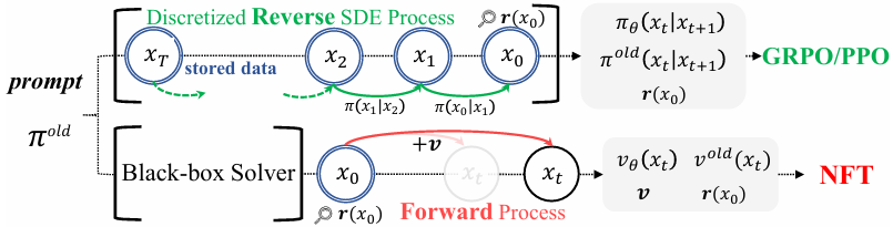 近年来,强化学习在大语言模型(LLMs)后训练中的巨大成功,催生了人们将类似方法迁移到扩散模型的探索。例如,FlowGRPO 等方法通过将扩散采样过程离散化为多步决策问题,从而在反向过程上应用策略梯度优化。然而,这一思路存在多重根本性局限:
