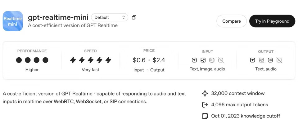 GPT-Realtime-Mini不支持任何高级特性,例如函数调用、结构化输出、微调、蒸馏或预测输出。
