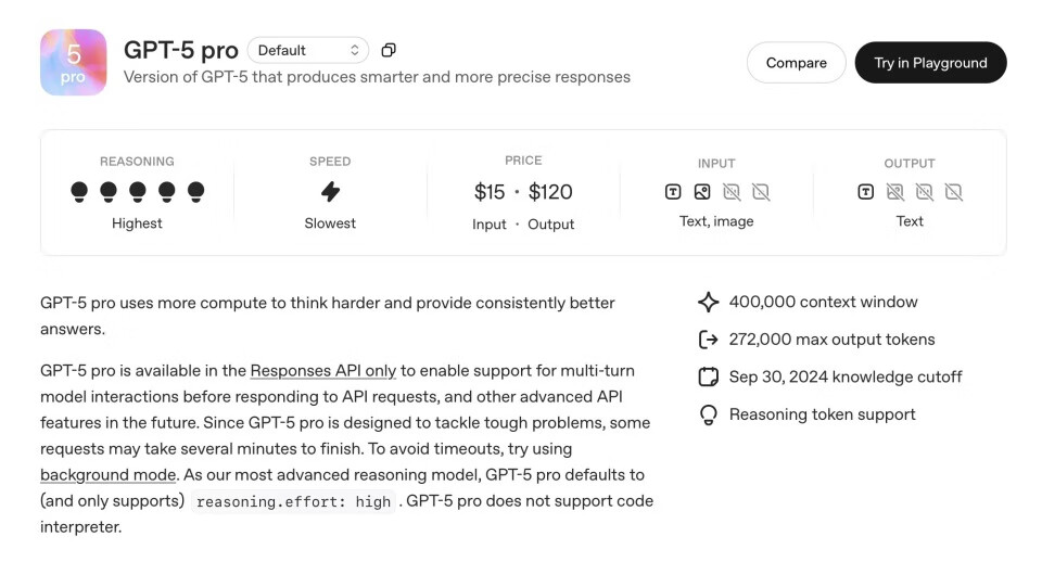 GPT-5 Pro的上下文窗口高达40万tokens,最大输出为27.2万tokens。它的知识截止日期是2024年9月30日。