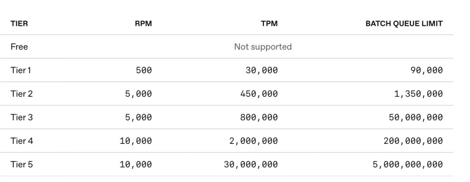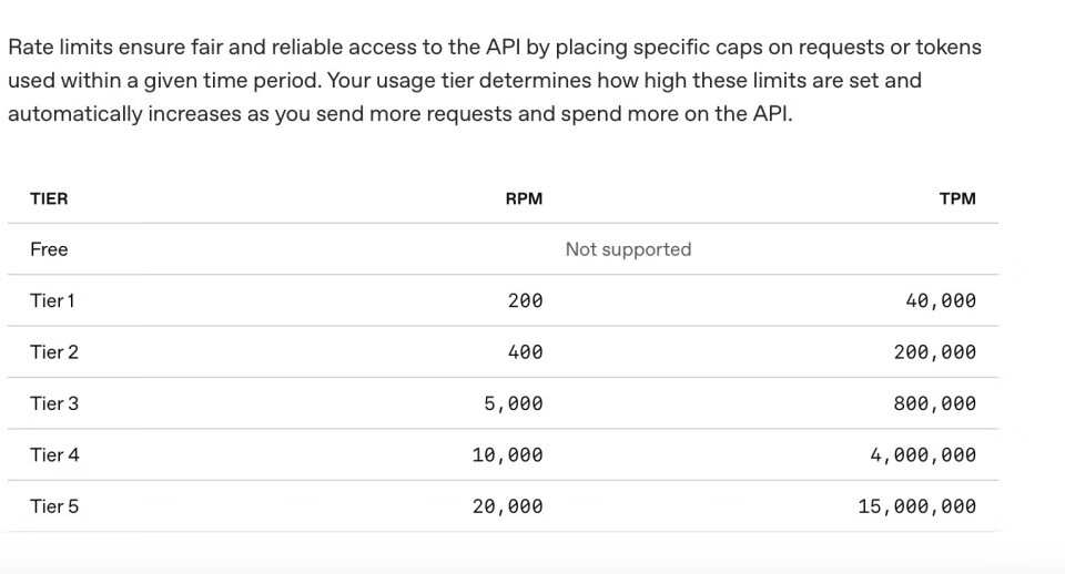 API访问受到速率限制的约束。这些限制取决于用户的使用层级,并会随着用户在API上的使用和支出增加而自动提高。例如,最高层级5的限制为每分钟2万个请求(RPM)和每分钟1500万个tokens(TPM)。