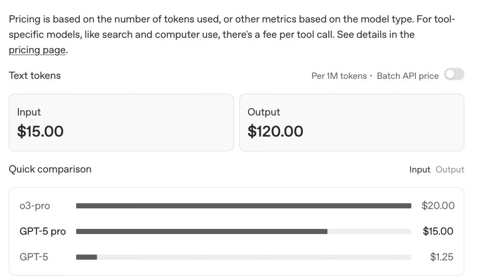 GPT-5 Pro的定价基于tokens使用量。每100万输入tokens的价格为15美元,每100万输出tokens的价格为120美元。