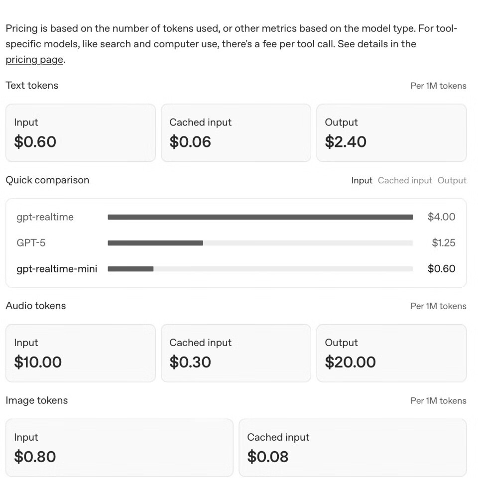 其中,文本tokens的计费标准为:每100万输入tokens价格0.60美元,每100万缓存输入tokens价格0.06美元,每100万输出tokens价格2.40美元;音频tokens的计费标准为:每100万输入tokens价格 10美元,每100万缓存输入tokens价格0.30美元,每100万输出tokens价格20美元。