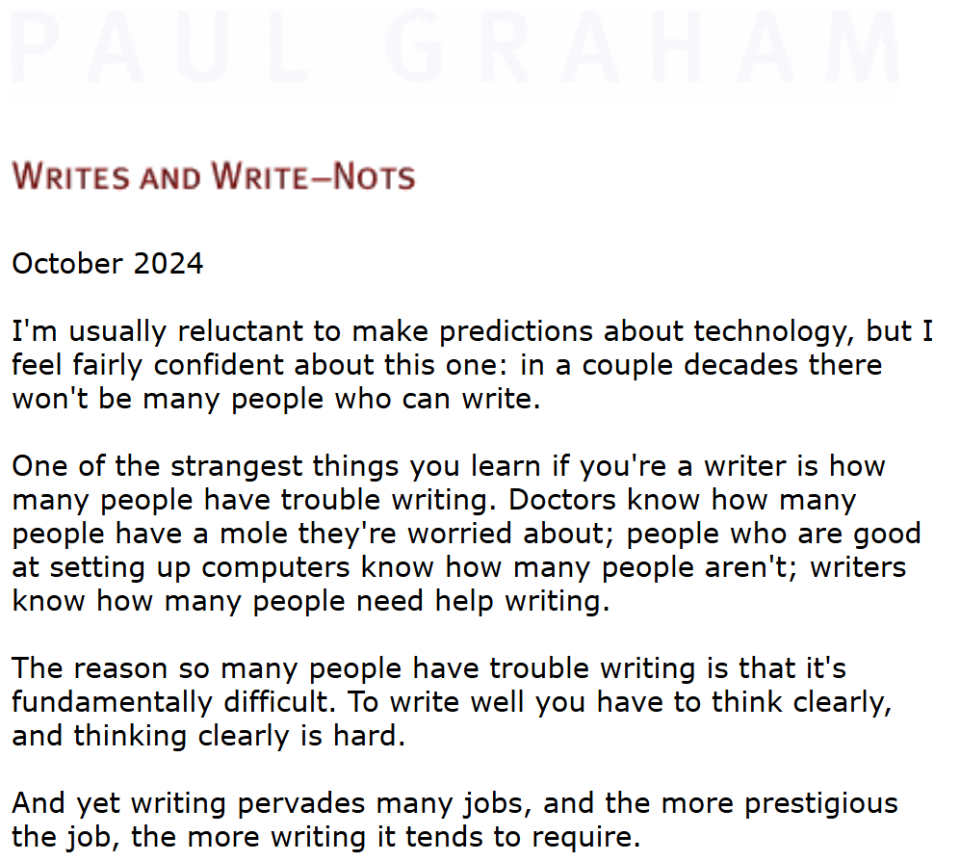 Paul Graham,著名的编程思想家,认为写作是思考的一部分,依赖AI生成内容会使我们失去独立思考的机会。