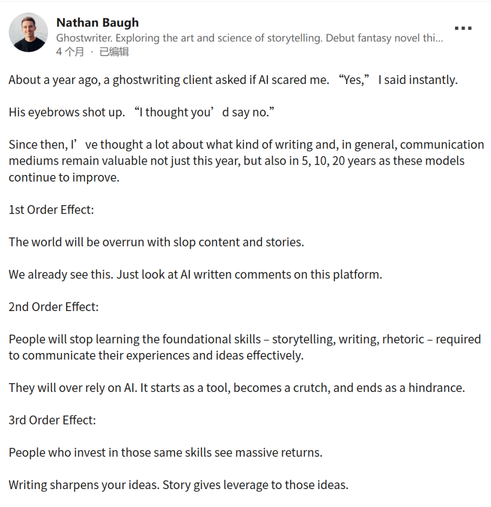 Nathan Baugh,一位内容创作者,警告AI可能导致内容泛滥,降低我们学习和表达的基础技能。