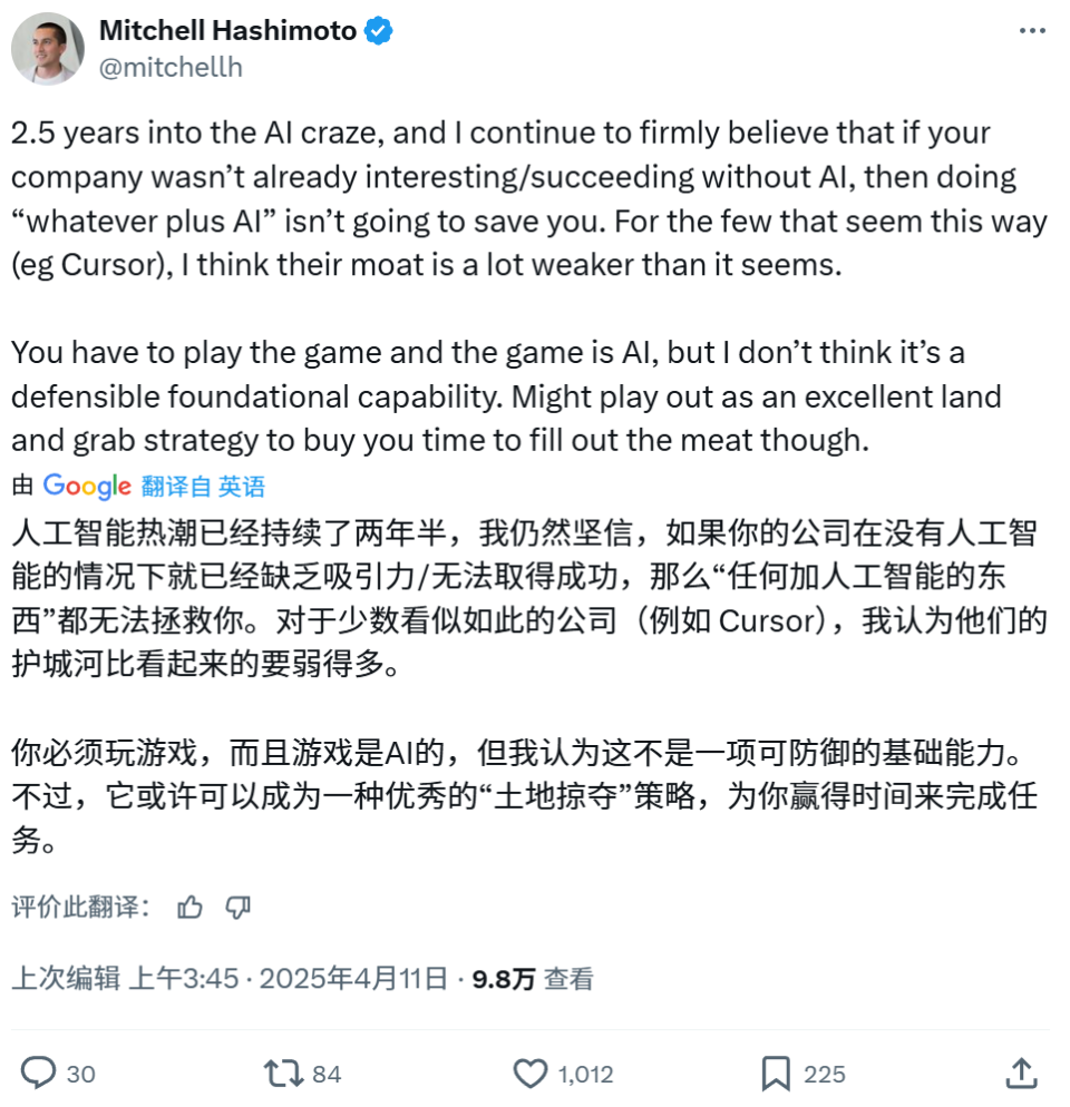 Mitchell Hashimoto,HashiCorp的创始人,认为虽然AI可以为技术创新提供支持,但真正的竞争力在于如何高效地利用AI,而非仅仅依赖它。