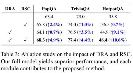 结果发现,只用 DRA,性能有提升;只用 RSC,性能也有提升。但只有当它俩合体时,才能发挥出最大的威力,达到 1+1>2 的效果。这说明,精准的检索和智能的生成校准,缺一不可。