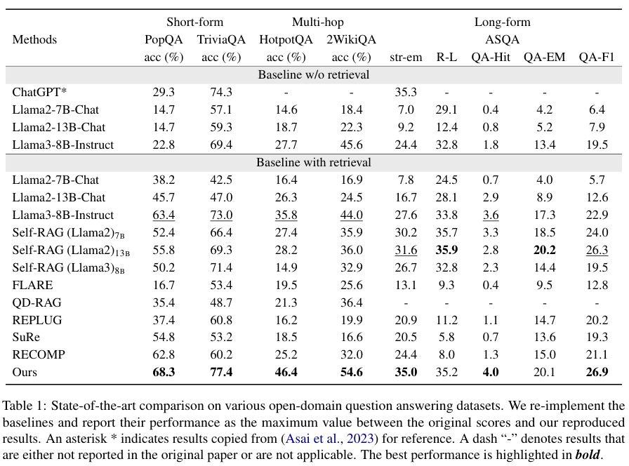 实验场景涵盖了短文本生成(比如 PopQA 和 TriviaQA)、长文本生成(ASQA)和需要多步推理的多跳问答(HotpotQA)。