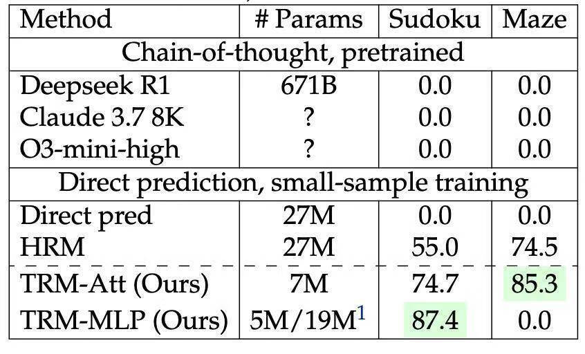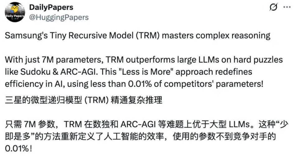 这个 TRM 有多离谱呢?一个仅包含 700 万个参数(比 HRM 还要小 4 倍)的网络,在某些最困难的推理基准测试中,其参数数量与 o3-mini 和 Gemini 2.5 Pro 等尖端语言模型相比,甚至可以超越它们,尽管这些模型的参数数量是 TRM 的 10,000 倍。