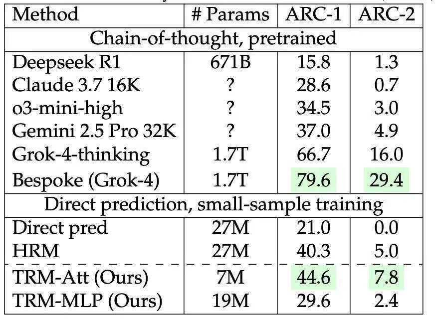 带自注意力机制的 TRM 在 Maze-Hard、ARC-AGI-1、ARC-AGI-2 上的准确率分别为 85.3%、44.6% 和 7.8%,模型规模为 700 万参数。