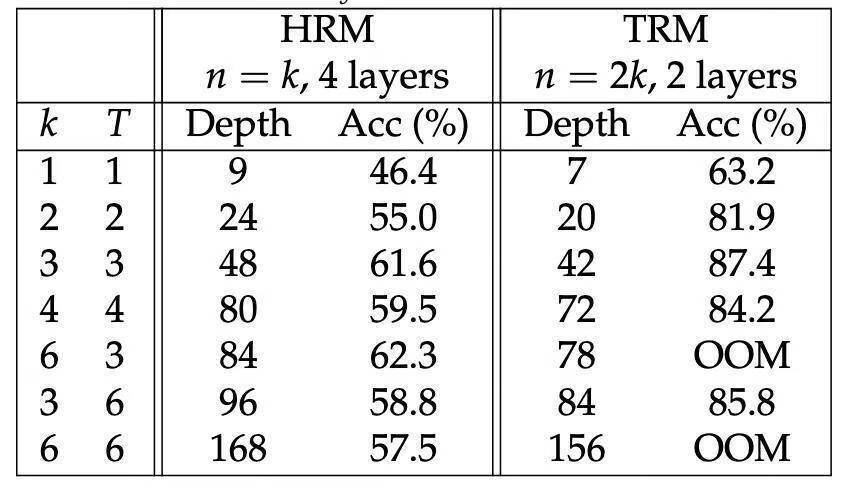 相比之下,使用 4 倍参数量(2700 万) 的 HRM 模型仅达到 74.5%、40.3% 和 5.0% 的准确率,显示出 TRM 在参数效率与泛化能力上的显著优势。