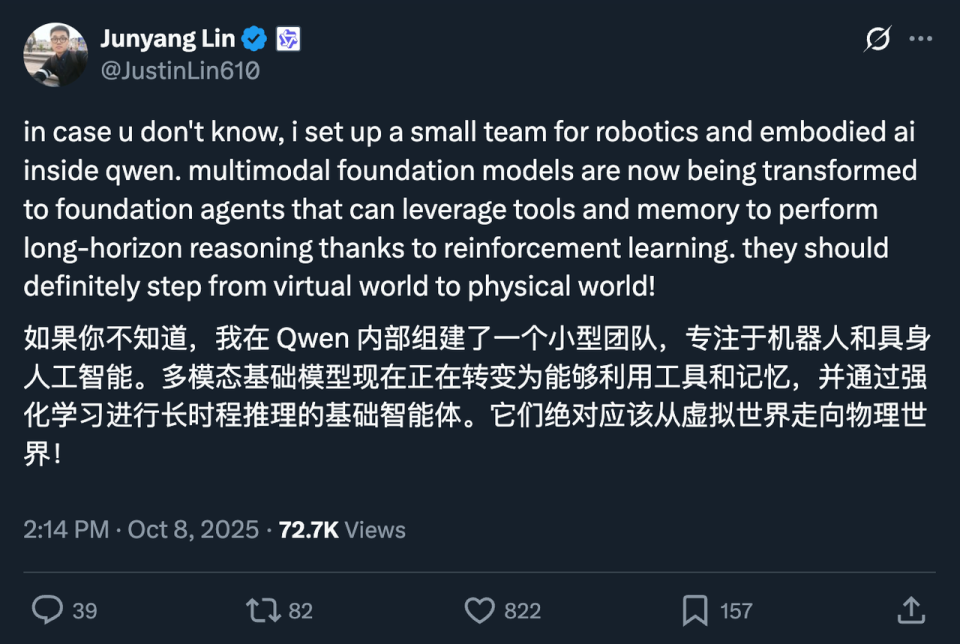 Qwen要做机器人了:林俊旸官宣成立具身智能团队