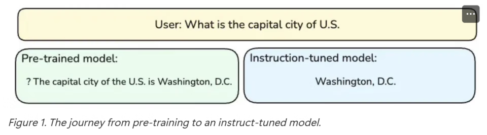 指令微调模型则会直接回答「Washington, D.C.」,因为它在训练中通常被优化为直接回答用户的问题,而不是仅仅做续写。