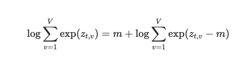 第二项就是常见的「log-sum-exp」项,它通常通过一种数值稳定的方式计算(称为「log-sum-exp 技巧」),如下所示。