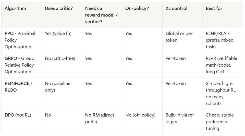 最初,社区主要使用 PPO(近端策略优化,Proximal Policy Optimization);但自 DeepSeek-V3 发布后,GRPO(组相对策略优化,Group Relative Policy Optimization) 成为了更受欢迎的选择。两者的主要区别在于:GRPO 去掉了单独的价值(critic)网络,而是通过组采样来估计相对优势,从而减少了内存与计算成本。