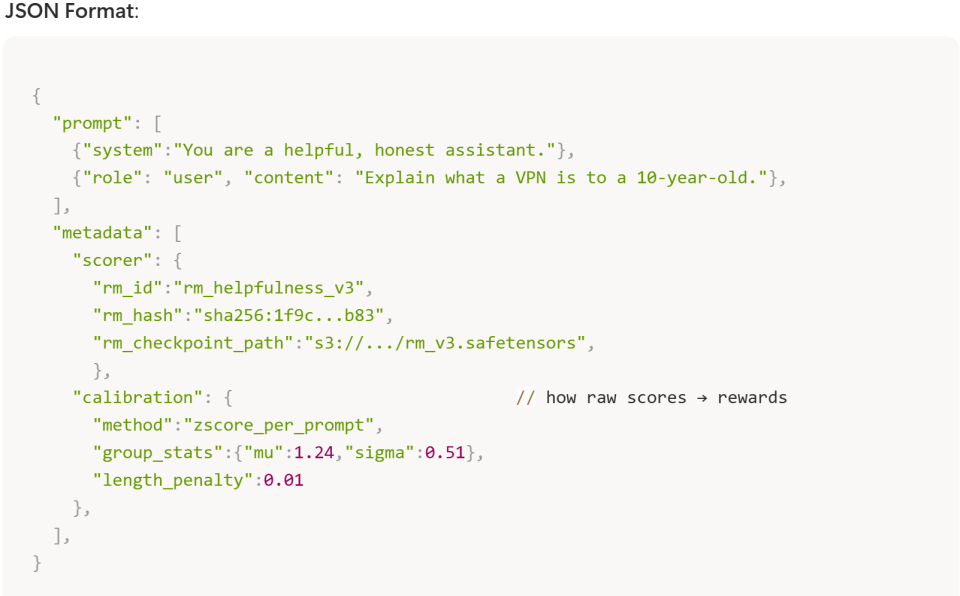 {"prompt": [{"system":"You are a helpful, honest assistant."},{"role": "user", "content": "Implement is_palindrome (s: str) -> bool. Ignore case and non-alphanumerics."},],"metadata": ["scorer": code_grader,"suite": {"suite_id": "palindrome_001_v3","suite_hash": "sha256:e2b4...9d","entry_point": "is_palindrome","runtime": {"image": "python:3.11", "timeout_s": 4, "mem_mb": 1024},"public_tests_count": 4,"hidden_tests_count": 18},],}