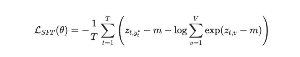 由于 z_t,v - m ≤ 0,这可以确保 exp (z_t,v - m)≤ 1,因此不会出现整数溢出问题。整数下溢会被安全地舍入为 0,这正是预期的行为。将这些结合起来,最终得到的 SFT 损失函数为: