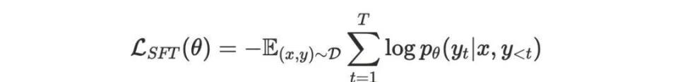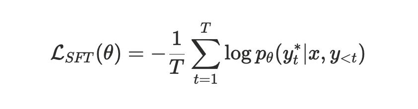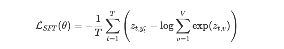 由于 SFT 本质上就是一个多分类问题(number of classes = vocab_size),因此用于训练模型的损失函数就是在给定输入 x 的条件下,生成正确序列 y 的负对数似然(NLL)。这一过程通常通过计算模型预测类别与数据集中真实类别之间的交叉熵来实现(在输出序列的每个 token 上进行)。数学形式如下所示: