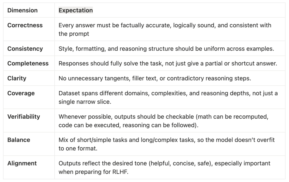 尤其对于推理模型而言,粗糙的数据会导致不忠实或不一致的思维链。例如,模型生成的解释并不真正反映其得出答案的推理过程。高质量的 SFT 数据应当准确、风格一致、避免无关的枝节,并且要与期望模型学习的能力相匹配。