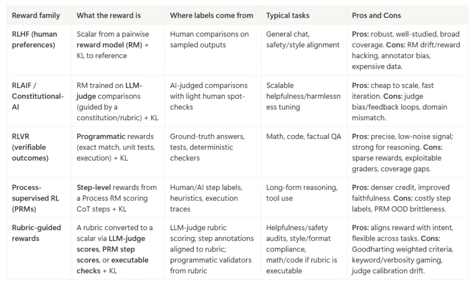 多种强化学习后训练技术(RLHF、RLAIF、RLVR),并详细解释奖励模型的工作机制;