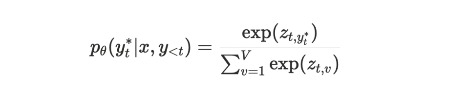 在实践中,这通常通过交叉熵函数来实现。在序列的第 t 步,设 y_t^* 为正确的 token(来自真实数据集)。设 p_θ(y_t^* | x,y_<t) 为参数为 θ 的模型生成 token y_t^* 的对数概率。然后模型会优化以下函数: