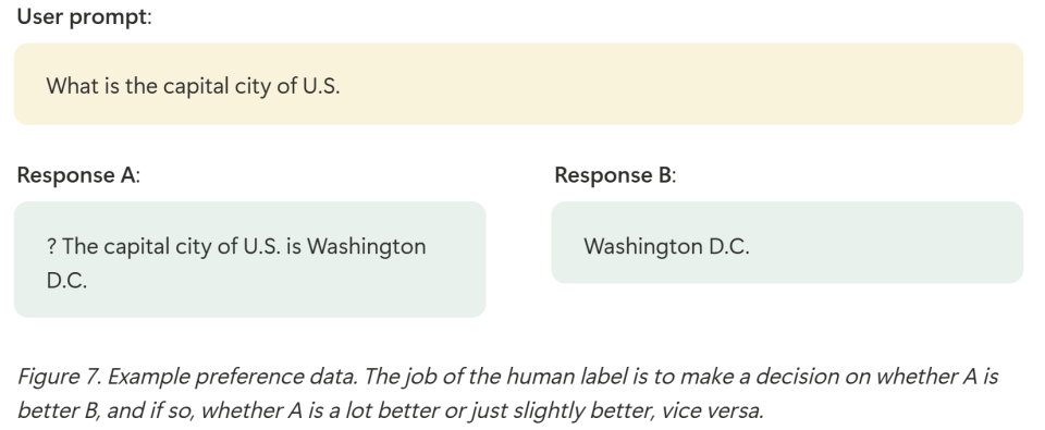 偏好数据的一般形式是:一个提示语配对两个回复,即成对比较(pairwise preference)。简单说就是一个模型生成两个回复(回复 A 和回复 B)。标注者判断 A 是否比 B 更好,或反之。还可以让标注者对多个回复进行整体排序,记录任意两个回复之间的比较。许多 RLHF 流程正是通过这种方式来构建奖励模型所需的数据集。