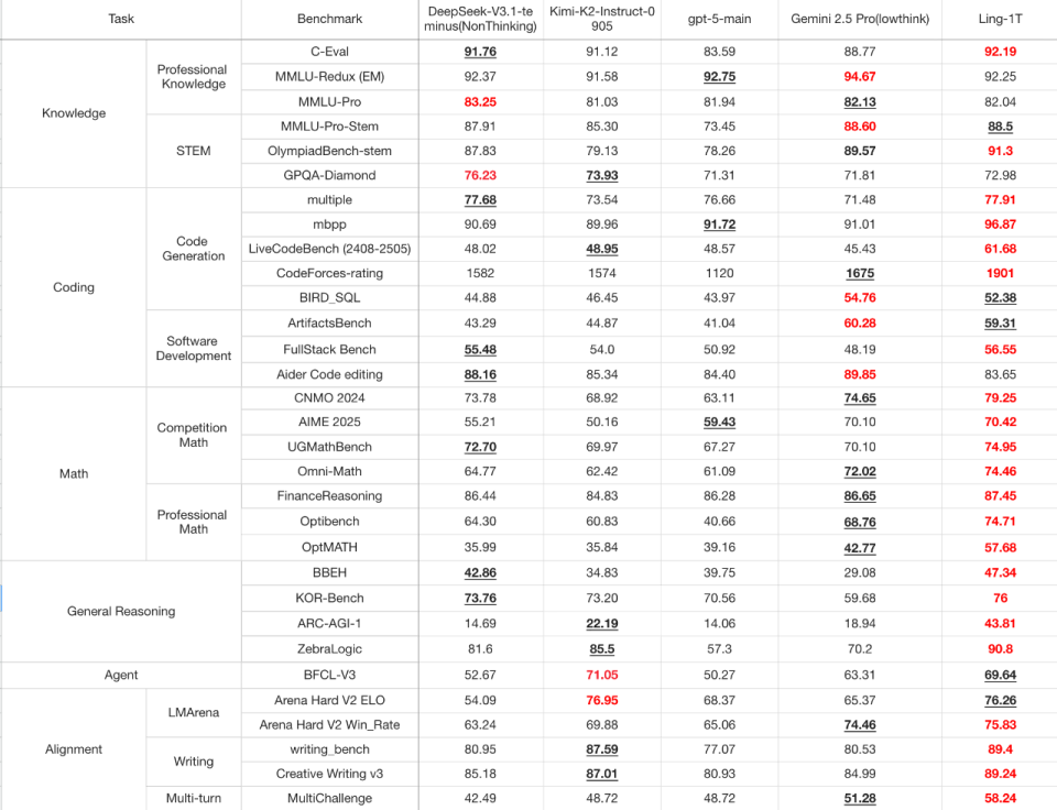 那么,Ling-1T 的「高质量输出」到底强在哪?官方晒出的成绩单显示,在多维基准测试中表现亮眼。