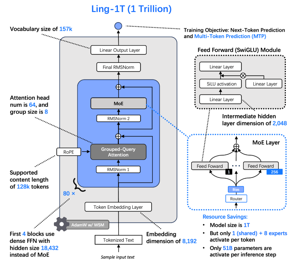 Ling-1T模型结构示意图,一款拥有 1 万亿参数的 MoE(Mixture of Experts)架构大模型,旨在保证强推理能力的同时,实现高效计算与低成本推理。