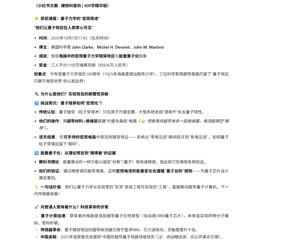 下面这篇 800 字的「诺奖物理学奖小红书文案」,几乎可以直接发布。信息精准、结构清晰、有节奏感,一点都不晦涩。