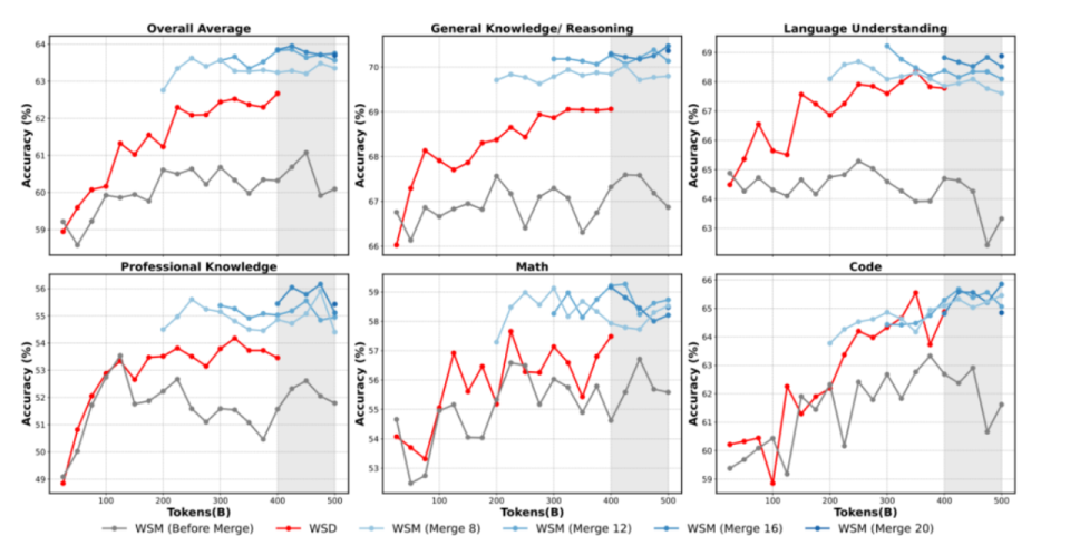 自研 WSM 调度器(Warmup–Stable–Merge) 替代传统策略,在中期合并多轮训练成果,模拟自然收敛。最终,大模型在综合能力、常识、语言理解、专业知识、数学与代码等多赛道上普遍跑赢旧策略。