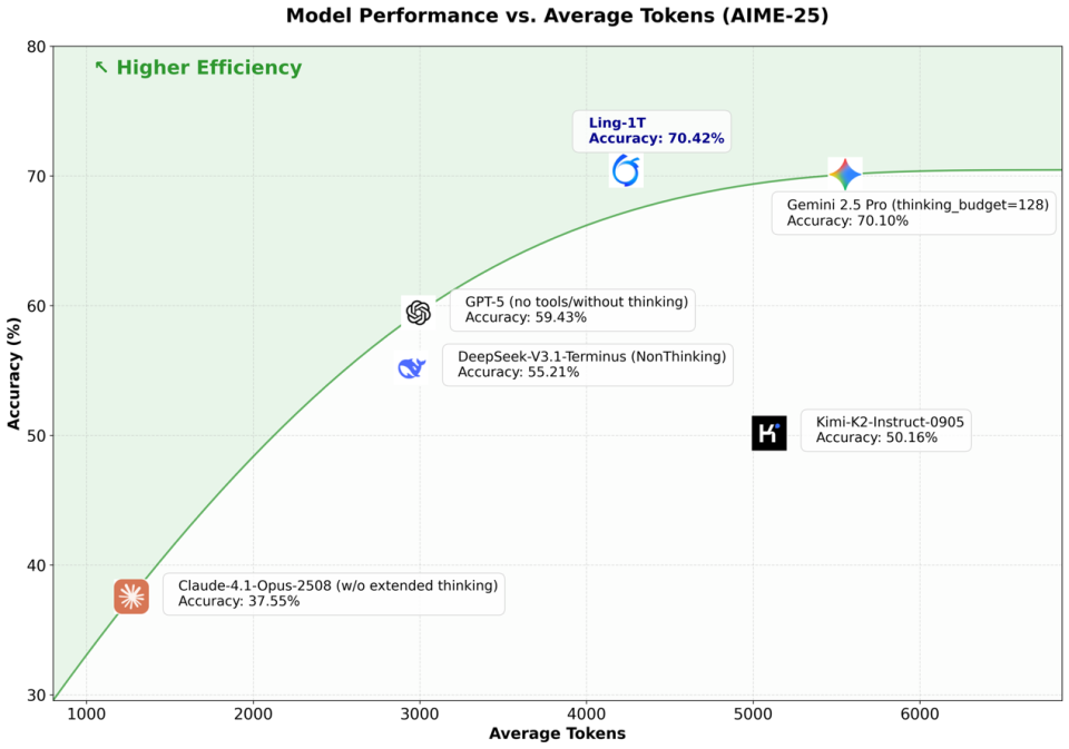 蓝色点代表Ling-1T,准确率高达 70.42%,与Gemini-2.5-Pro(70.1%)并列最高精度,但后者用了更长的输出(更多 token)。