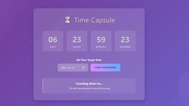 因为上面的倒计时功能有 bug,我们又抽了一次卡。下面这个虽然色彩不如前一稿惊艳,但它的「巧思」藏在底部文案里,比如「时间晶体」、「量子纠缠倒计时」。倒数功能也完全正常。