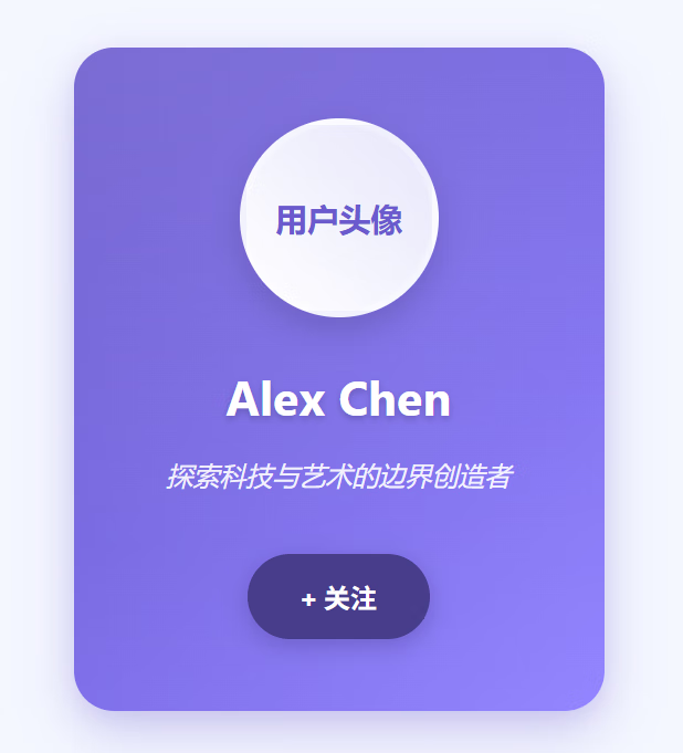 提示词:请生成一个蓝紫色主题(主色调为 #6A5ACD,辅助色为白色)的现代用户卡片组件。卡片内必须包含:1. 用户头像(圆形占位符);2. 用户名;3. 一句签名(使用斜体字);4. 一个蓝色关注按钮;5. 整体布局居中。