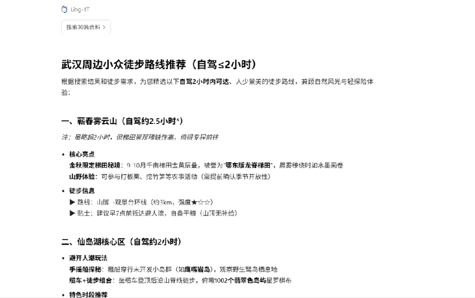 最后,看看它的执行能力。任务很具体——「介绍武汉附近私藏、小众徒步路线,自驾不超过 2 小时,适合周末短期出行。」