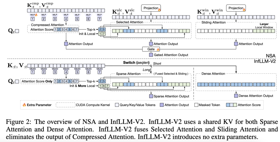无缝短长切换:仅用一套共享键值缓存(零额外参数),把 NSA 多分支并为单一分支;与稠密注意力在参数与计算方式上完全对齐,按序列长度动态切换稠密/稀疏,训练更稳。
