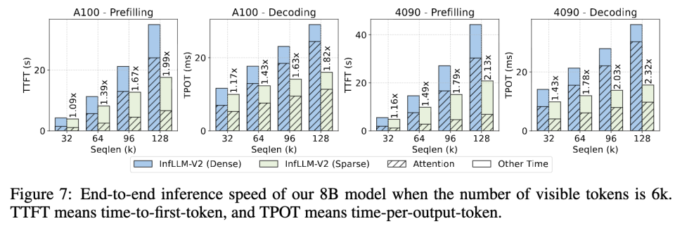 结果表明,InfLLM‑V2相对稠密注意力可获得显著加速,在128K长文本中,InfLLM-V2 可实现4-9倍算子加速比。