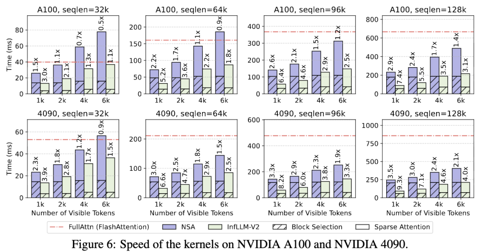 研究人员在A100与4090两款芯片上对InfLLM-V2进行了推理效率评测。