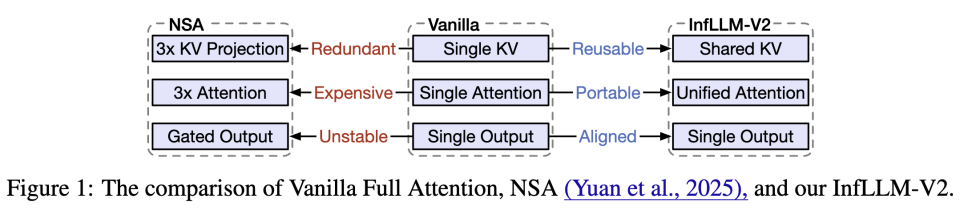 NSA虽然采用了成熟的块稀疏结构并配套专用CUDA内核,但其架构与主流的「短序列预训练—长序列微调」范式存在明显错配:引入三套独立的 KV 缓存与三种注意力分支,在「长序列微调」中将使得模型收敛不稳,并且对短序列场景增加了大量的额外开销。