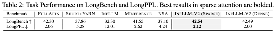 在以上技术的支持下,InfLLM-V2仅需使用5B词元即可实现稀疏注意力模型的训练!